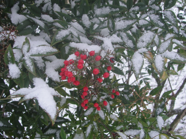 It’s been snowing overnight, hard enough to settle on the roof and grass, and it’s been snowing lightly but steadily all day. The temperature’s dropped and is now around -3o C. We spent this afternoon feeding the birds and shaking about 10cm of snow off the fleeces over the kale and winter onions.