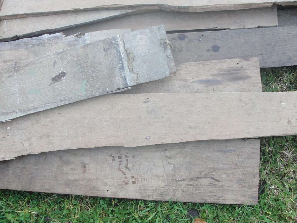 Harry and his partner have taken up the floorboards, removed the old joists (basically, tree branches with a flattened edge cut on them), dug out the soil underneath, put in a damp-proof membrane and a wooden ‘trestle’ structure and nailed a solid deck on the trestle. Then he went off for a few days to prepare the boards themselves.