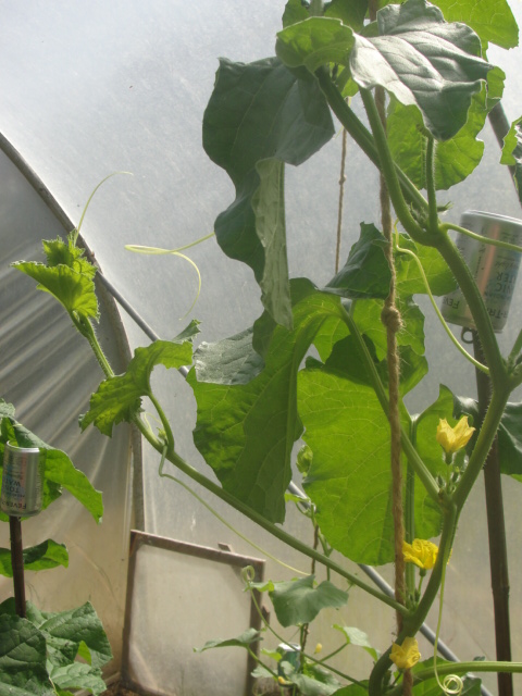 Clipping the spare shoots off the cucumber vines is a constant job. Cucumber and melon vines grow side-shoots from the joint between main stem and leaf, exactly as tomato plants do, and it’s best to remove those as soon as they form. I have had the experience of letting those just grow, and not being able to get into the polytunnel without treading on vines sprawling across the path. We spent two days that year cutting back those shoots, disappearing into thickets of vines snaking across the floor and taking barrow-loads of vine cuttings away to be dumped. These days I get in there twice a week to prune back the sideshoots and tie up the new growth to the ropes. Each plant has a thick twine tied to the crop bars seven feet off the floor to grow up (you can just see it in the photo, with knots in it for the ties to grip and not slide down like Nora Batty’s tights).