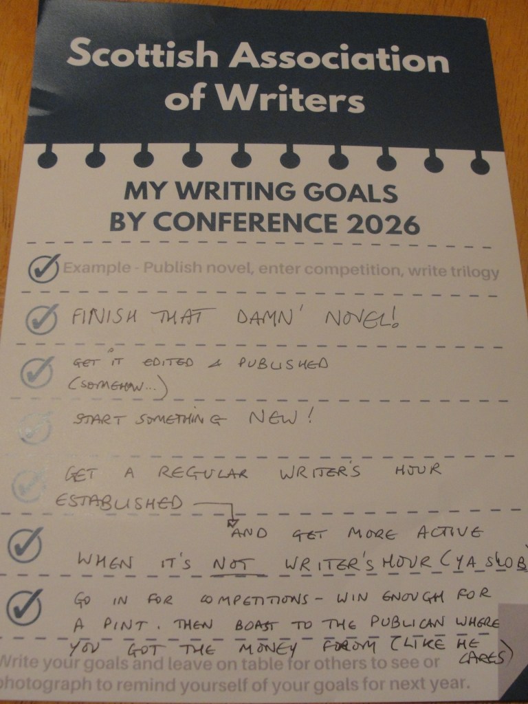 This year, SAW invited us to fill in sheets saying what goals we set ourselves for the next twelve months. We’ll see.