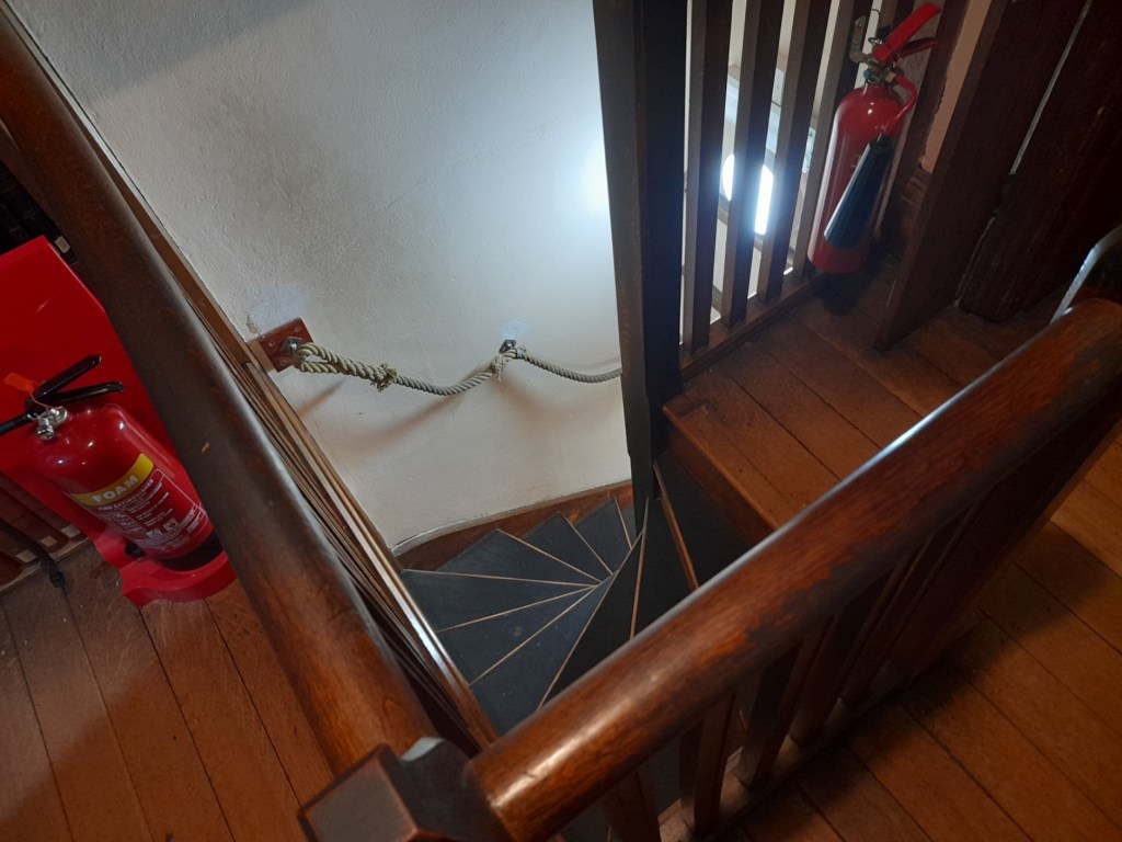 Tight spiral stairs between the ground floor and gallery